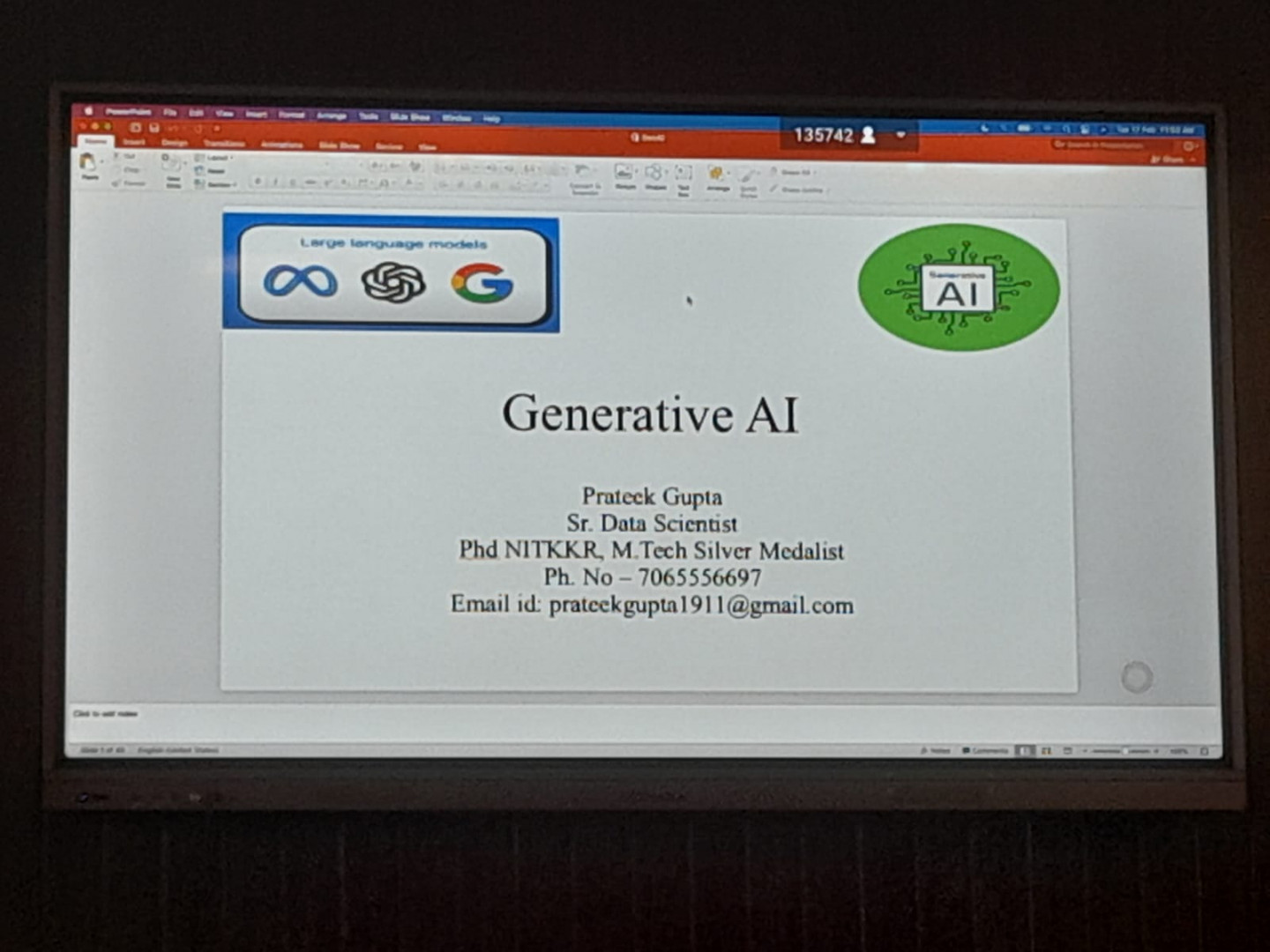 The speaker (Mr. Pratik Gupta) demonstrated how Generative AI systems are trained using training datasets, supervised learning, unsupervised learning, and fine-tuning techniques. Practical examples were shown using AI tools for content generation, image synthesis, chatbot development, and code automation. Concepts such as prompt engineering, model training lifecycle, data preprocessing, and model evaluation metrics were also discussed.